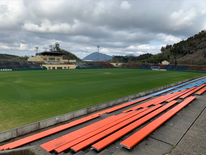 立派な屋根付きの観戦スタンドもあります。 「サニックス グローバルアリーナスタジアム」、メインの会場となる綺麗な天然芝コートです。