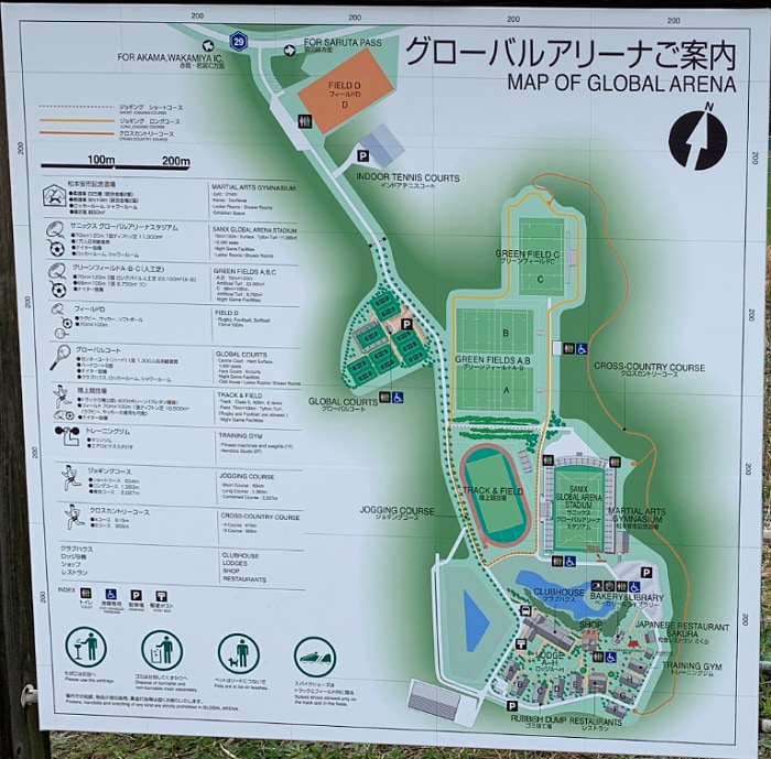 混雑している場合は少し歩けばスタジアムにもトイレは2か所ありますのでそちらを使用すると良いでしょう。 多目的な施設ですので宿泊施設やバーベキューコーナー等色々な建物があります。
