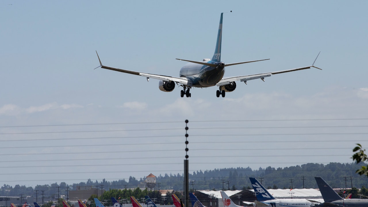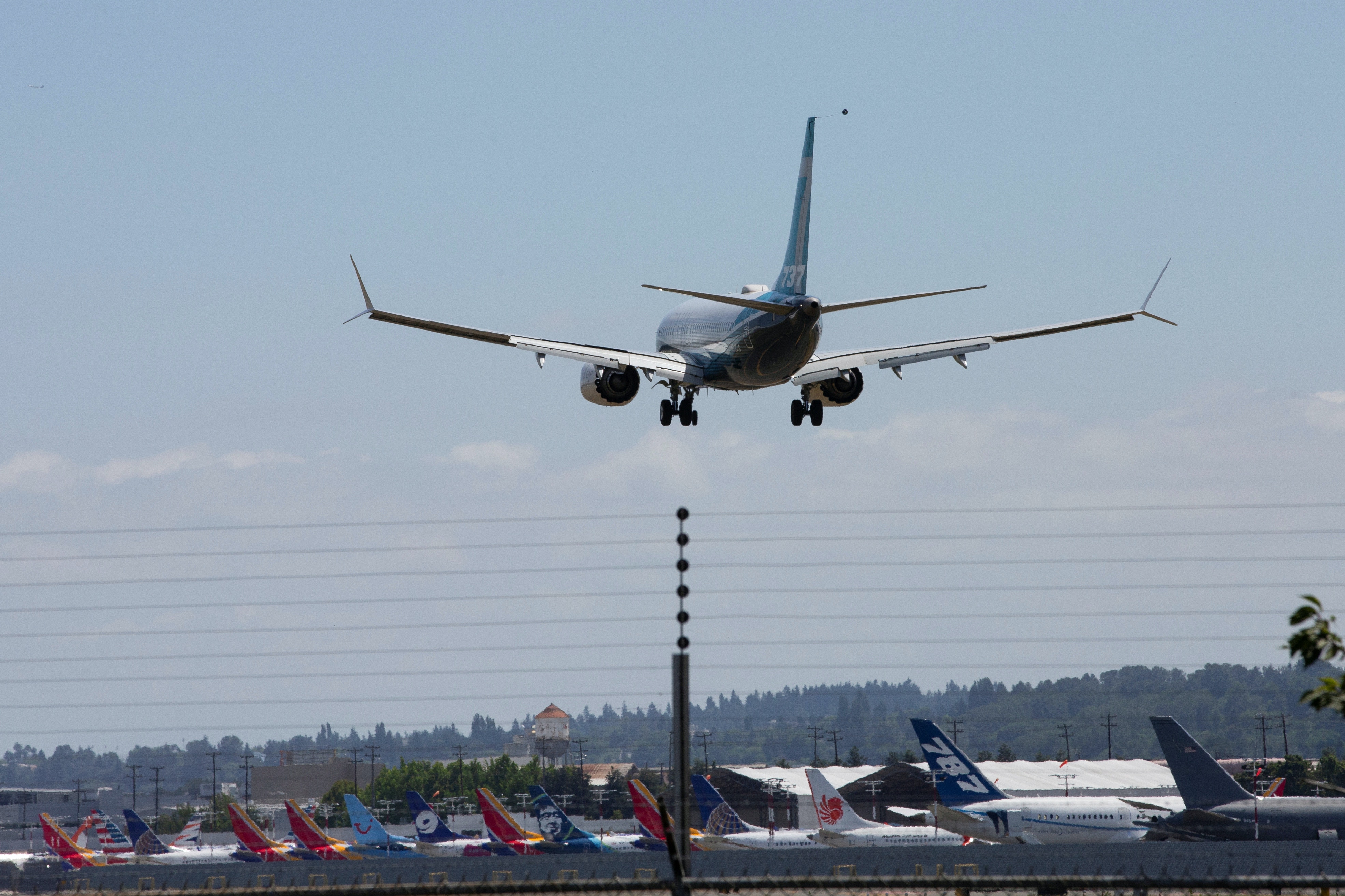 美國波音公司的737 MAX客機6月29日在華盛頓州完成第一場重新認證的試飛。圖為這部客機當天在西雅圖市的波音機場着陸。(Reuters)
