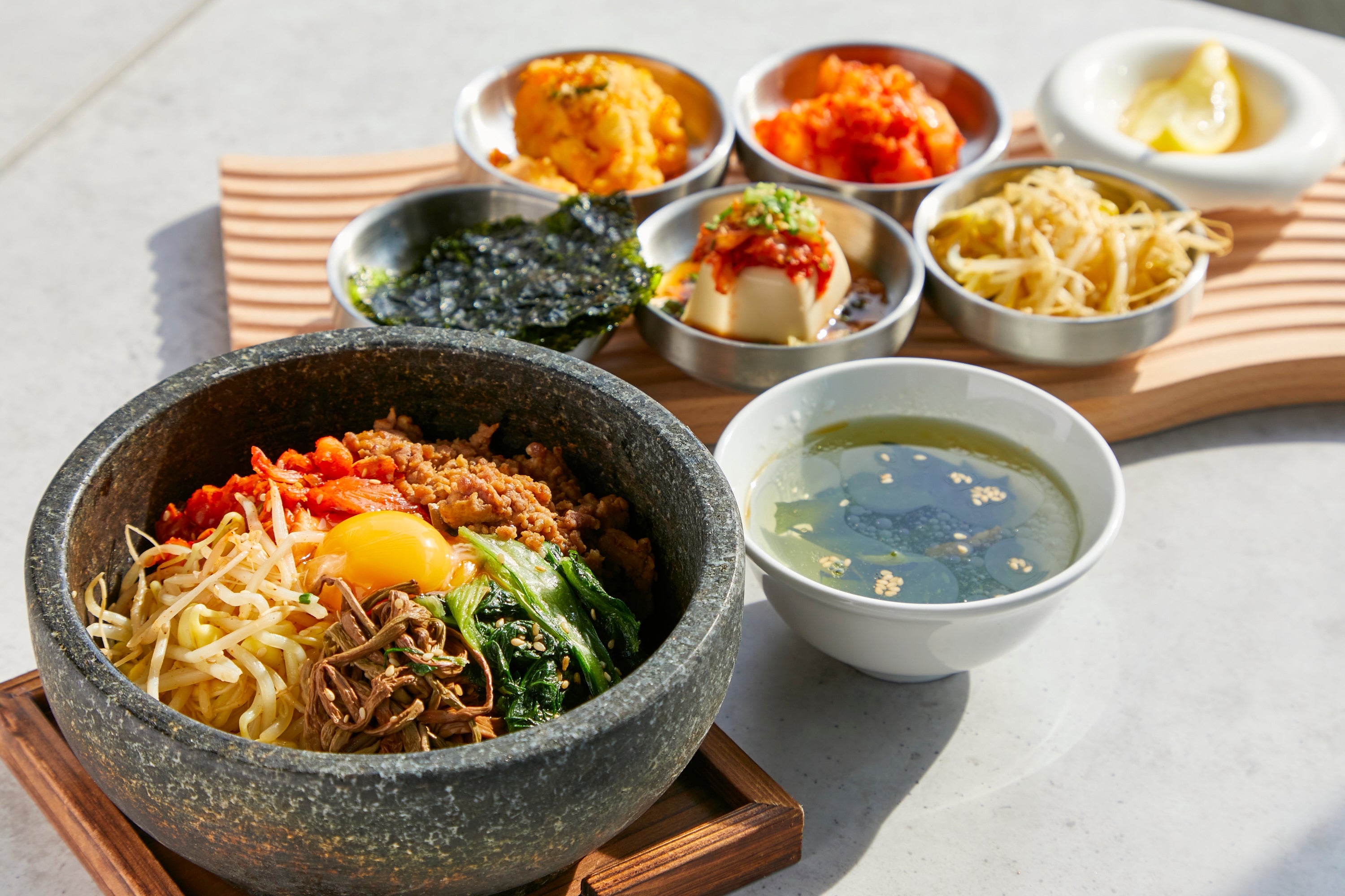ランチはビビンバやチゲなどのメインを選び、日替わりの5種類の小鉢、デザートがついて満足感に満たされ ます。