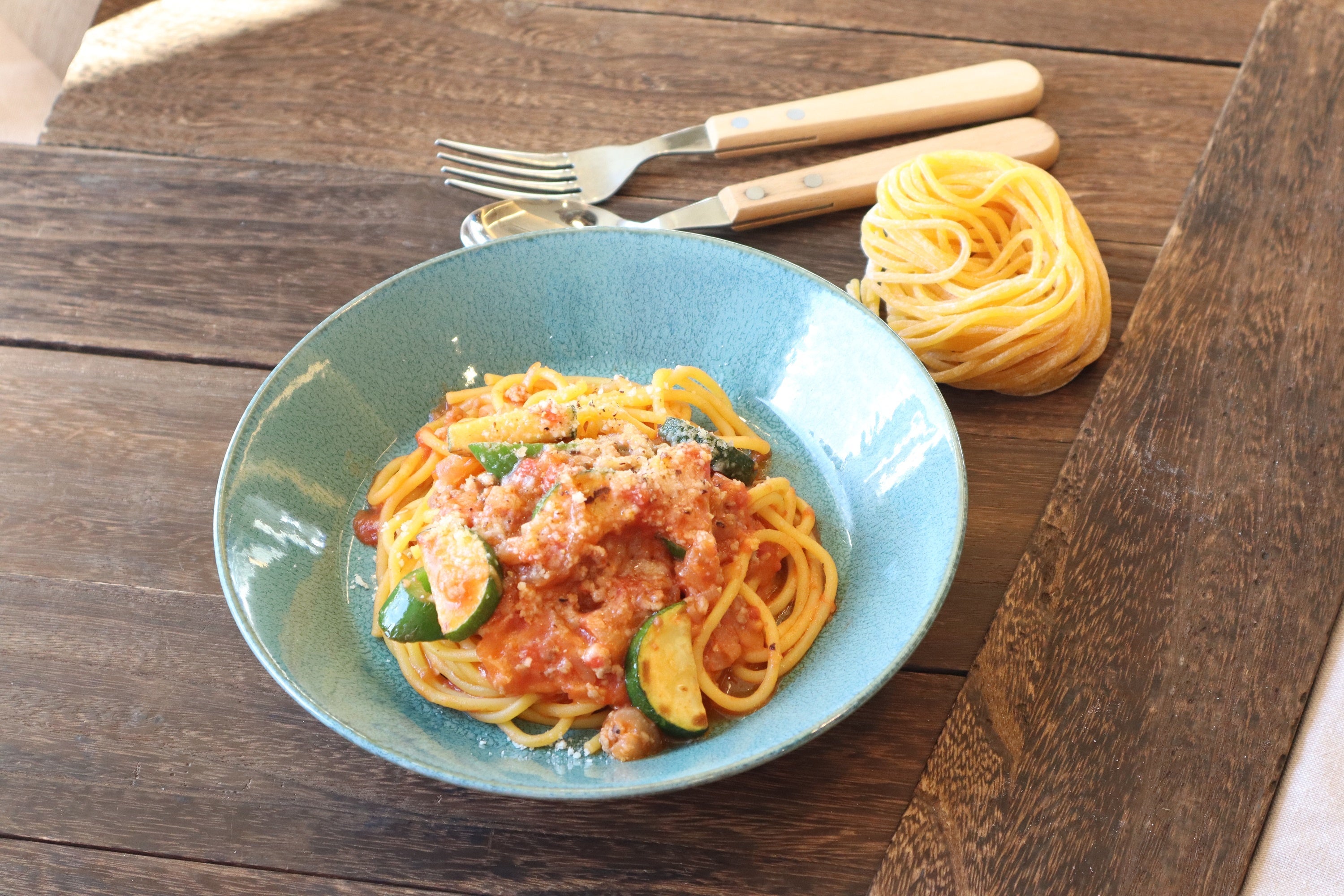 ソースは、香草を入れ田舎風の味付けに。そして、今が時期の万願寺唐辛子とズッキーニはトマトソースとの相性も抜群です。