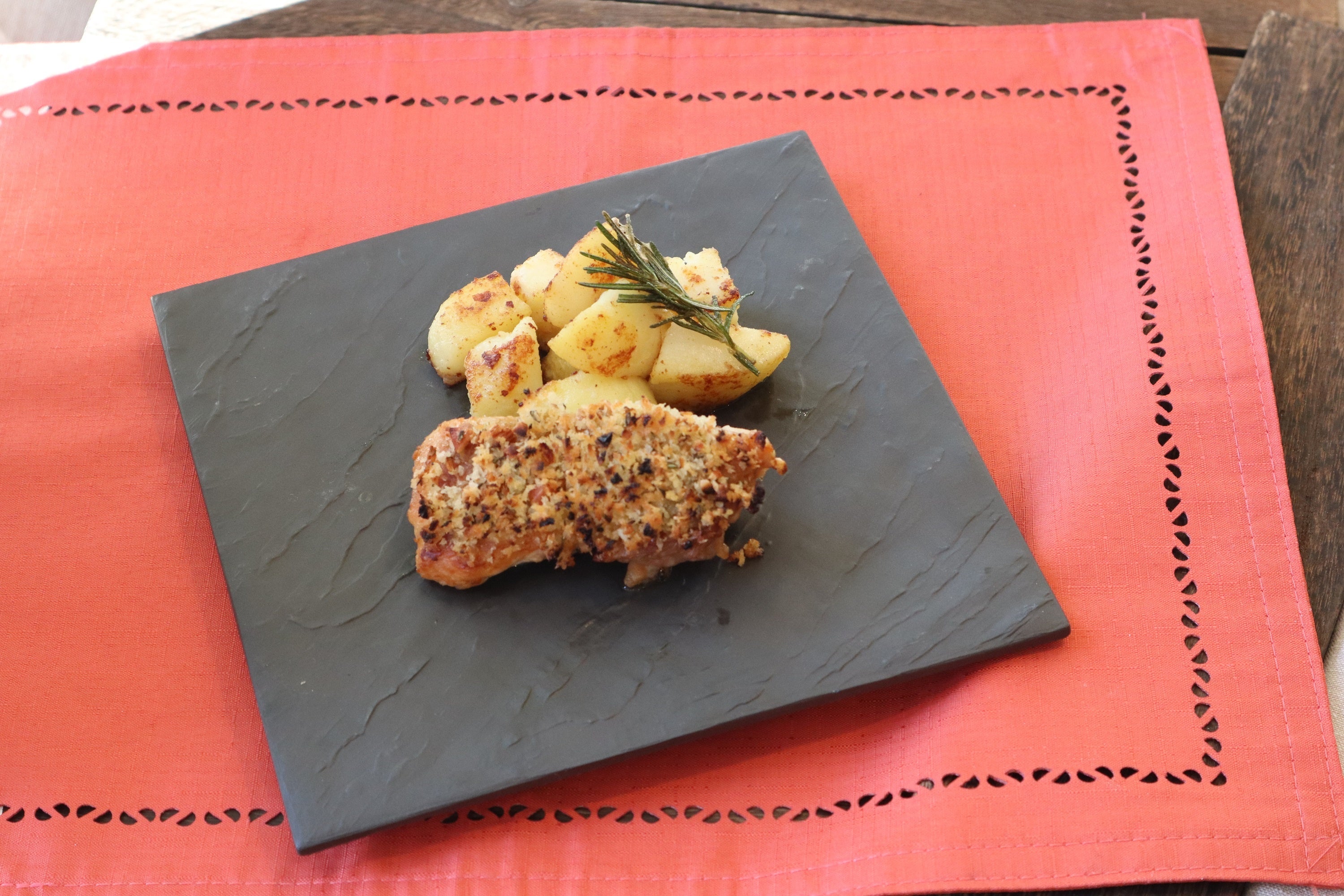 マスタードが効いた大人味のチキンに、さらにガーリックが効いた、パン粉をのせて香ばしく仕上げます。