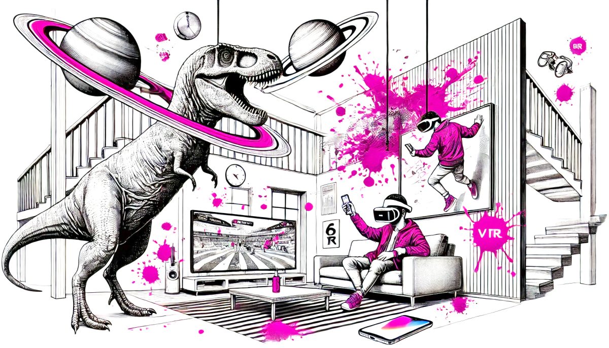 Es müssen doch nicht immer Hunde, Katzen oder Goldfische sein. Ich habe zum ersten Mal im Leben einen Dinosaurier gestreichelt, einen Tyrannosaurus Rex. Er kam zu mir ins Wohnzimmer, wir hatten uns 66 Millionen Jahre nicht mehr gesehen. Mir war gar nicht bewusst, wie verdammt groß er ist. Aber zum Glück haben wir im Altbau die hohen Decken. Dann bin ich durch den 3,5 Milliarden Kilometer entfernten Ring des Saturn geklettert, das wollte ich schon als Kind mal machen. Und die EM-Spiele? Privat viewing natürlich. Ich habe sie mir auf einen sechs Meter Screen über mein Sofa gezogen. Was nach ganz normalem Alltag für Business Punks klingt, wird mit der neuen Apple Vision Pro noch ein bisschen cooler. Ab 12. Juli ist sie in Deutschland zu haben. Play hard: Wir haben die Mixed-Reality-Brille jetzt schon mal getestet.